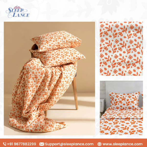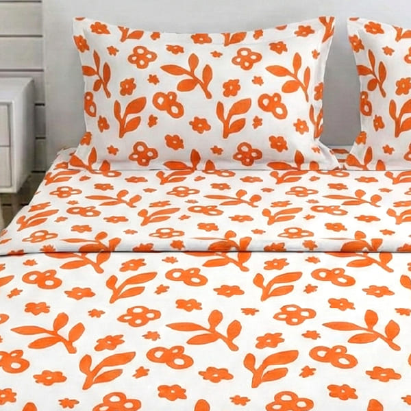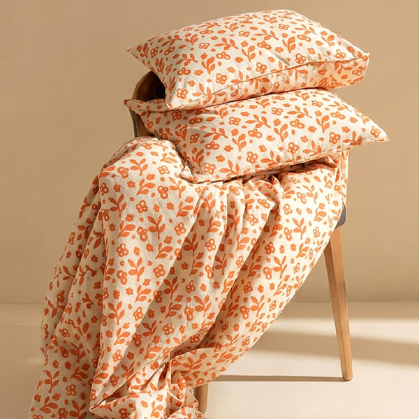 Bring the glow of a Mediterranean summer into your bedroom. This pattern features whimsical, hand-drawn floral motifs in a vibrant apricot hue against a crisp, creamy backdrop. It’s a spirited design that balances artisanal charm with a modern, sunny disposition—perfect for creating a space that feels bright, welcoming, and full of life.